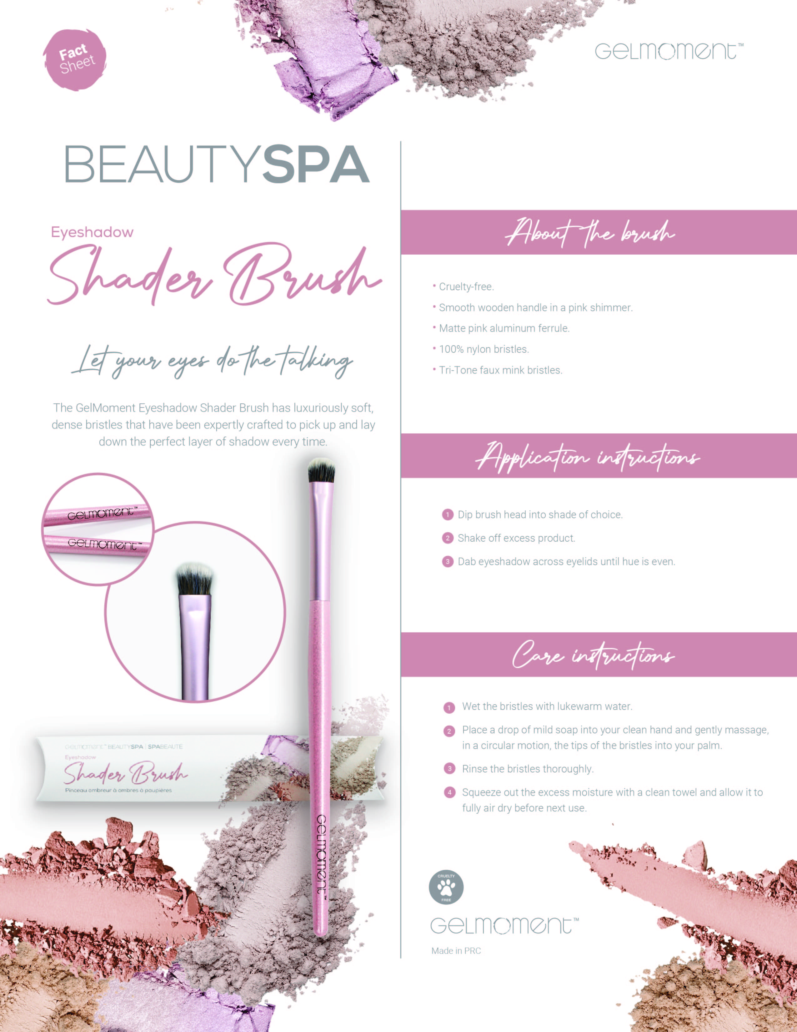 Maximize the potential of your GelMoment Eyeshadow Palettes by applying them with our quality crafted Eyeshadow Shader Brush and Blending Brush, both made with 100% nylon, tri-tone faux mink bristles. Let your eyes do the talking with results that speak for themselves.